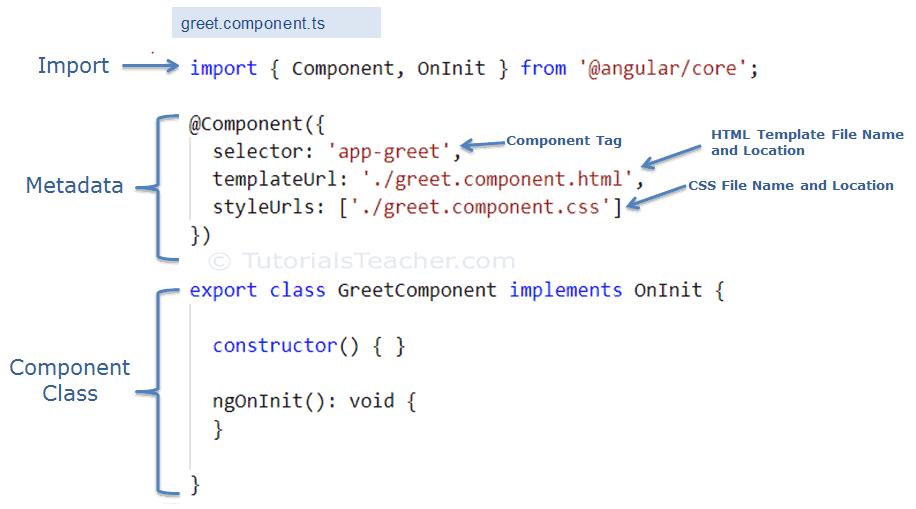 Component Class: GreetComponent is the component class. It contains properties and methods to interact with the view through an Angular API. It implements the OnInit interface, which is a lifecycle hook.