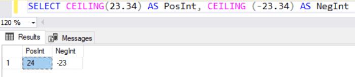 SELECT CEILING(23.34) AS PosInt, CEILING (-23.34) AS NegInt