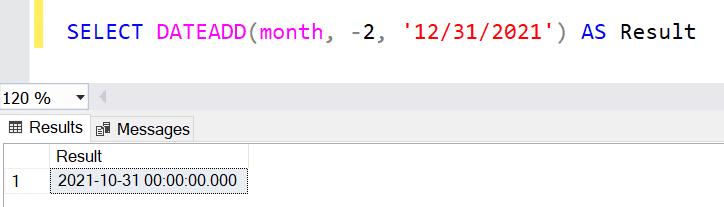 SELECT DATEADD(month, -2, '12/31/2021 123') AS Result