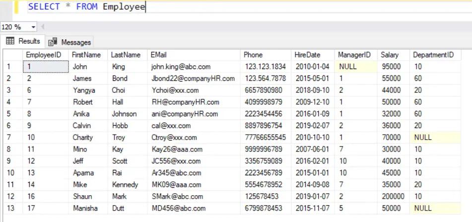 Now, consider the following Employee table where two rows has NULL value in the DepartmentID column.