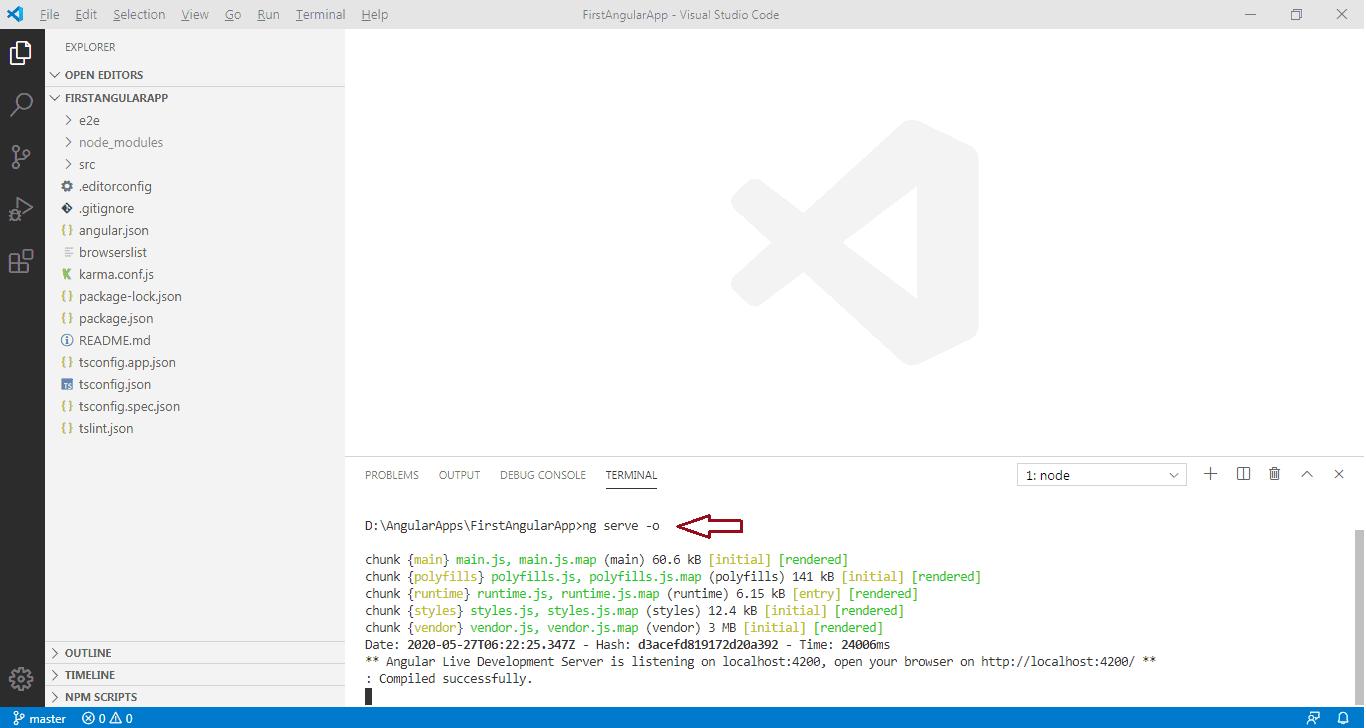 Open the terminal in VS Code from menu Terminal -> New Terminal, and type ng serve -o command and press enter, as shown below.