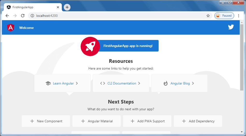 Use NPM command npm start to build an application. Internally, it uses ng serve command only. Open a browser and navigate to http://localhost:4200 to see the application home page. The http://localhost:4200 is the default URL of an Angular application created using Angular CLI.