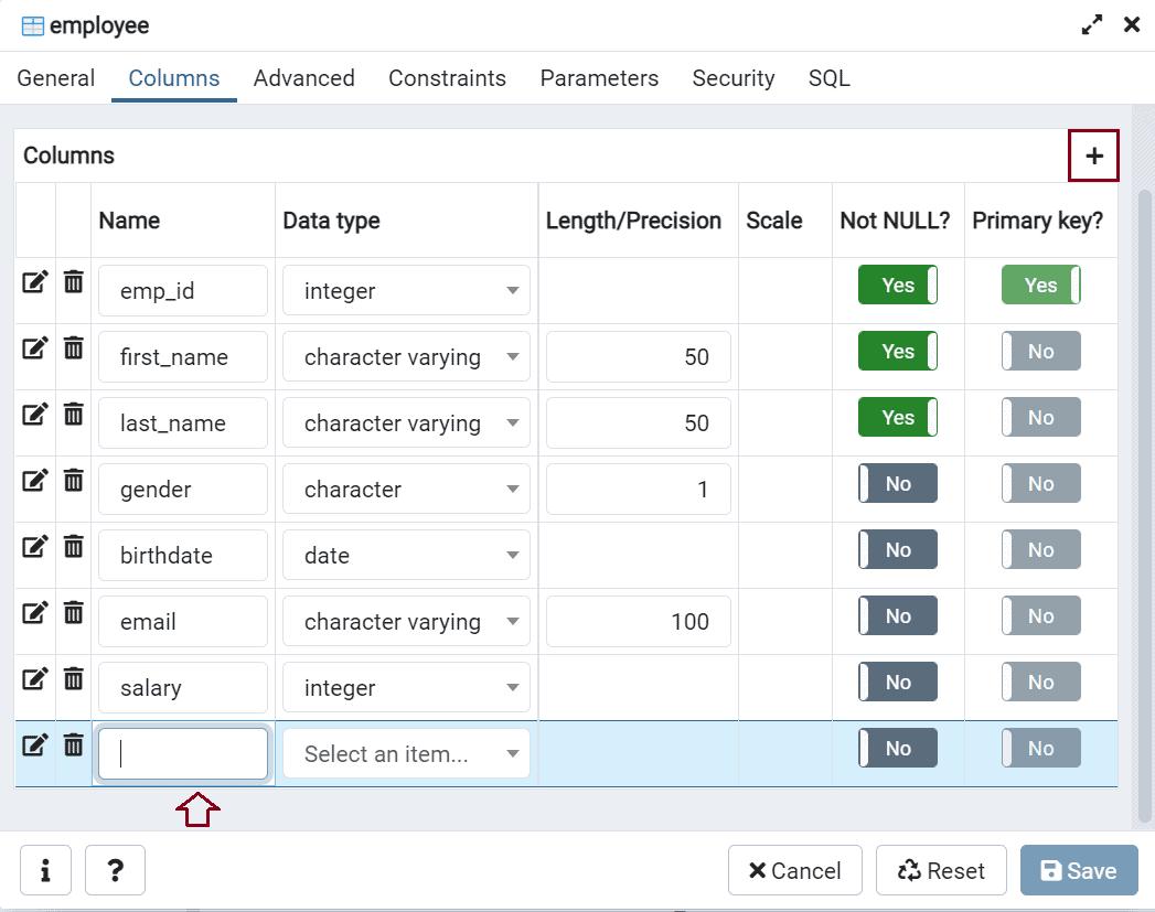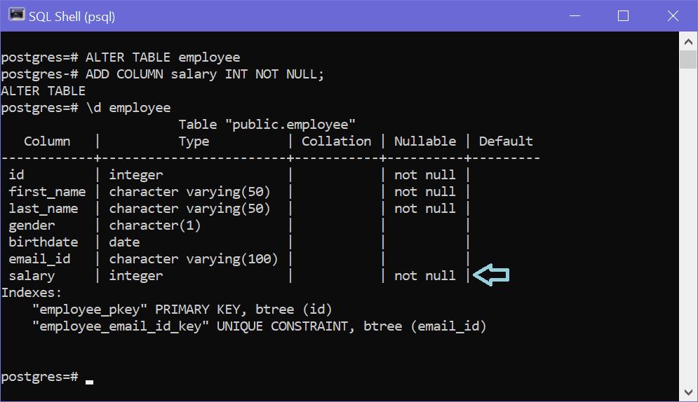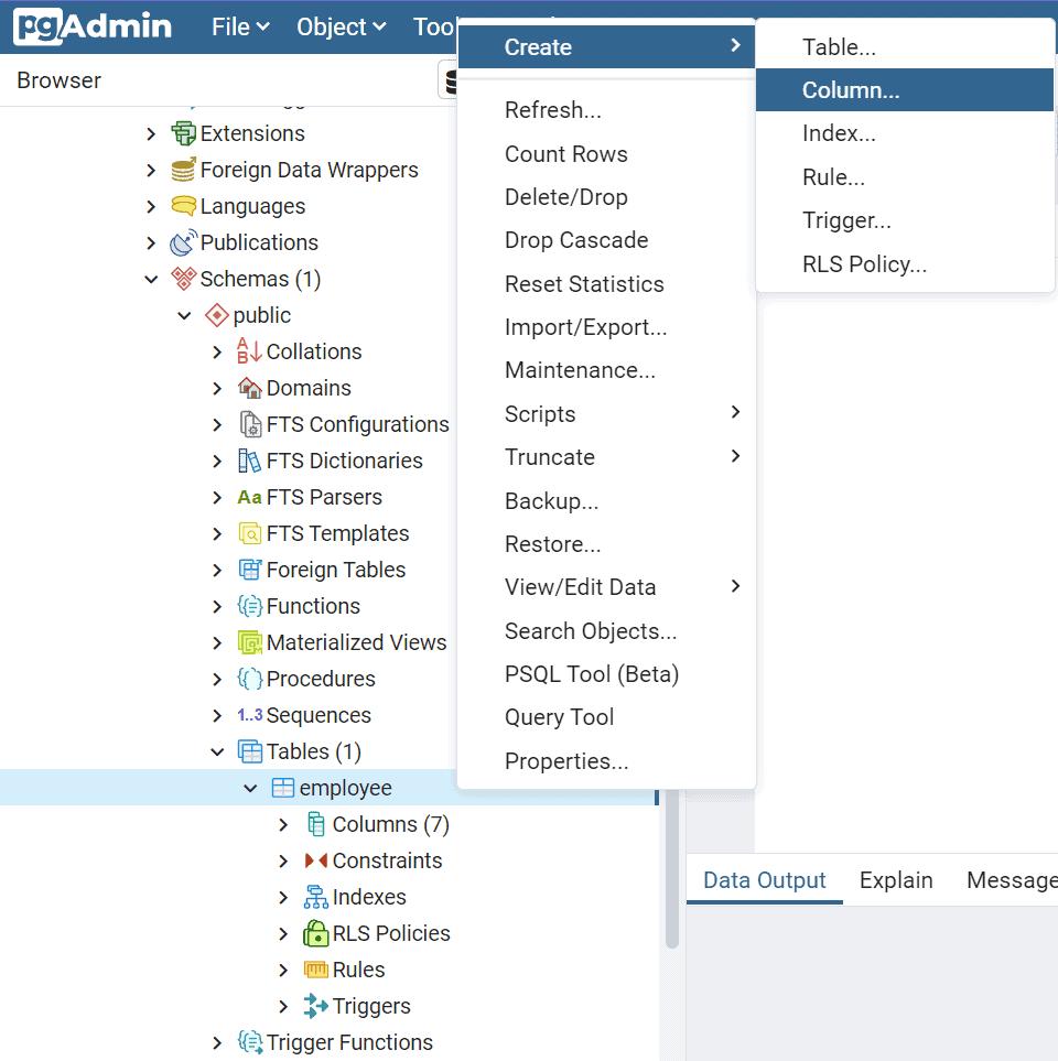 ADD COLUMN salary INT;Add Column using pgAdmin