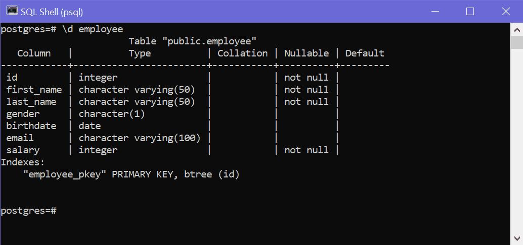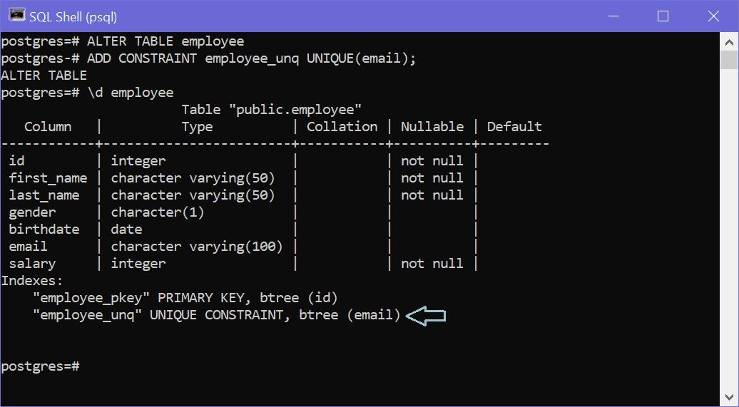 ADD CONSTRAINT employee_unq UNIQUE(email);The following is the result of the above statement.