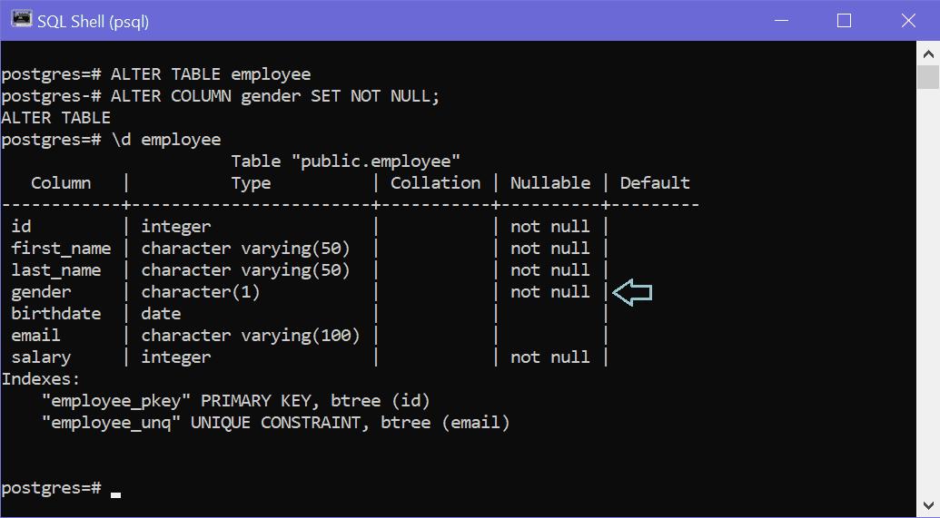 The following will set the NOT NULL constraint on the gender column of the employee table.
