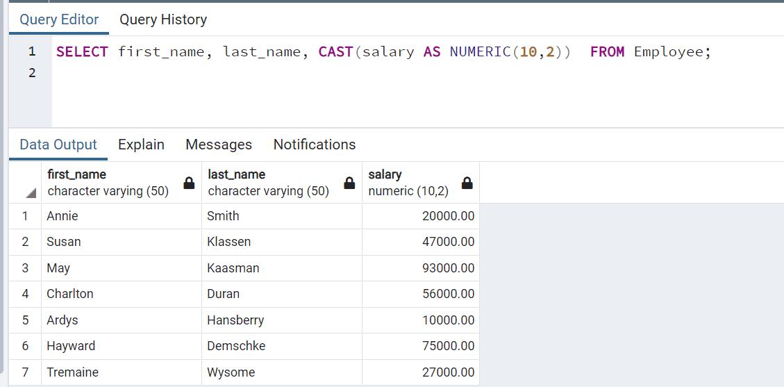 SELECT first_name, last_name, CAST(salary AS NUMERIC(10,2)) FROM Employee;