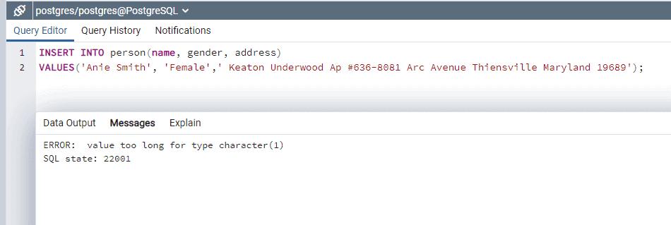 VALUES('Anie Smith', 'Female',' Keaton Underwood Ap #636-8081 Arc Avenue Thiensville Maryland 19689');PostgreSQL clearly raises an error as the value is too large for the CHARACTER(1). This is because we specified CHAR for gender column that set gender column as CHARACTER(1) by default and we are trying to insert 5 character value 'Female' to it.
