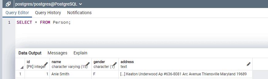 VALUES('Anie Smith ', 'F ',' Keaton Underwood Ap #636-8081 Arc Avenue Thiensville Maryland 19689');This time value got inserted as PostgreSQL truncated trailing spaces for name and gender columns and stored only character values 'Anie Smith' as name and 'F' in the gender columns.