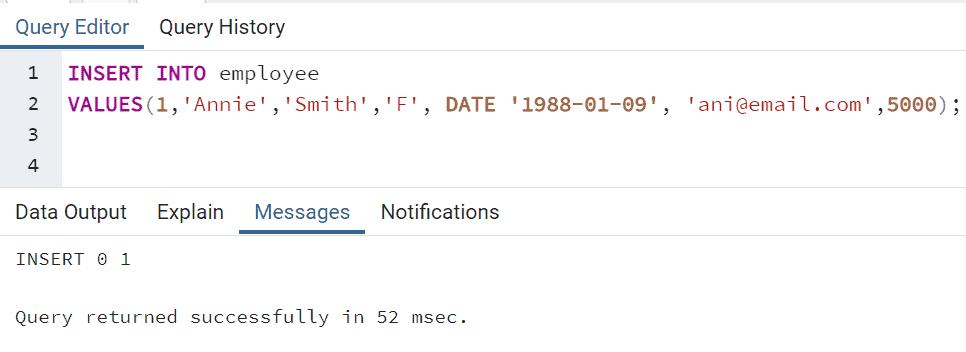 VALUES(1,'Annie','Smith','F', DATE '1988-01-09', '[email protected]',5000);You can change the order of the columns or remove columns from the INSERT statement as per your need.