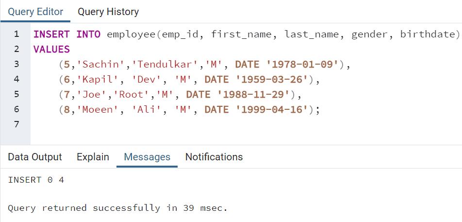(8,'Moeen', 'Ali', 'M', DATE '1999-04-16');The above query will insert four rows into the employee table and display the following result in pgAdmin.