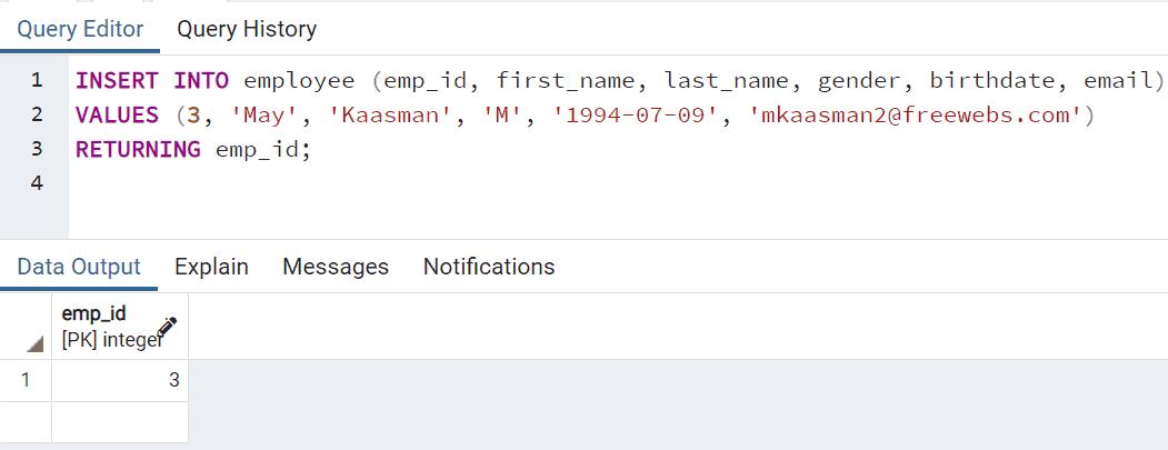 To return specific inserted column after insertion, specify column name after RETURNING clause. Bellow will insert data to the employee table and return the newly inserted emp_id.