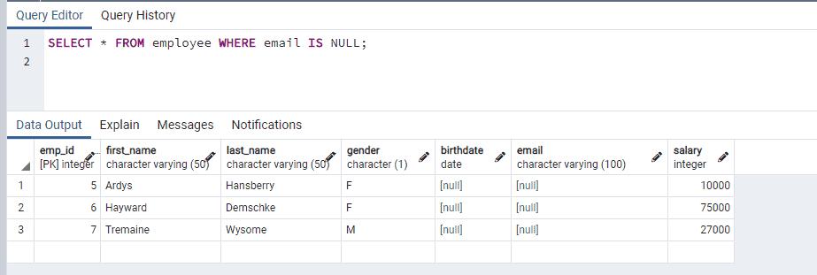 In the above table, the email column includes NULL values. The following query fetches employees whose email is NULL using IS NULL operator.