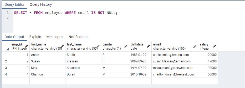 SELECT * FROM employee WHERE email IS NOT NULL;
