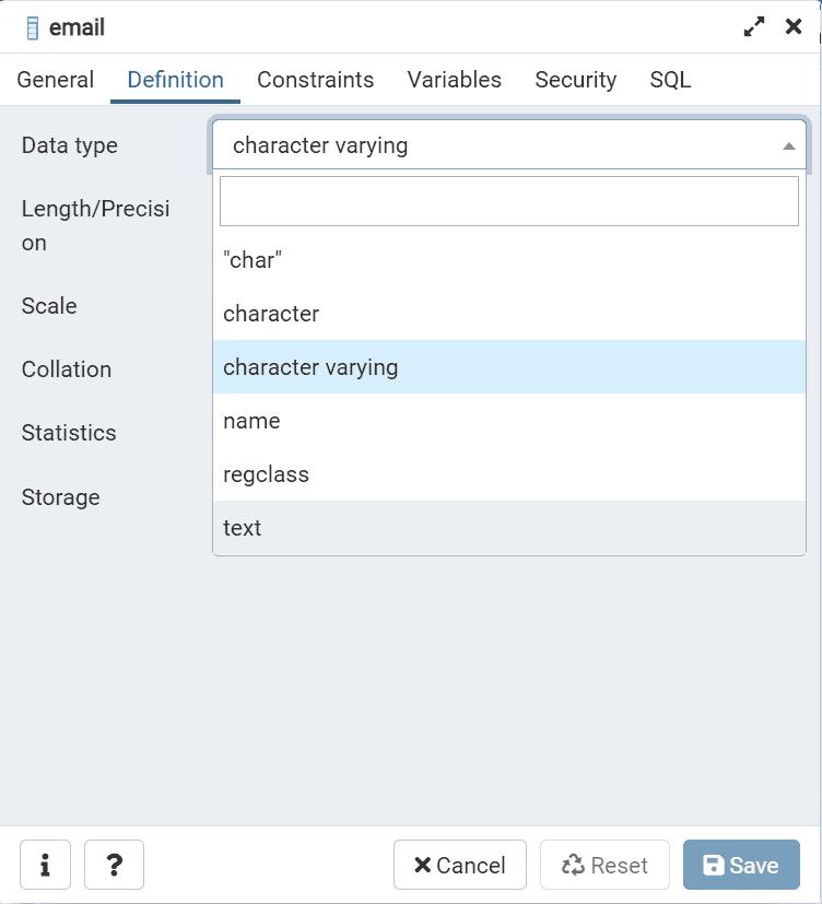 ALTER COLUMN email TYPE TEXT;PostgreSQL does implicit auto-casting of data from old data type to new data type when you do ALTER COLUM. In some cases, like converting VARCHAR to INT, casting fails and PostgreSQL will give error that column cannot be casted automatically and will ask you to specify manual casting by specifying the USING clause.