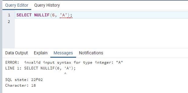 Both the arguments specified in the NULLIF() function must be convertible to a common datatype otherwise it will raise an error.
