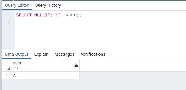 SELECT NULLIF('A', NULL);