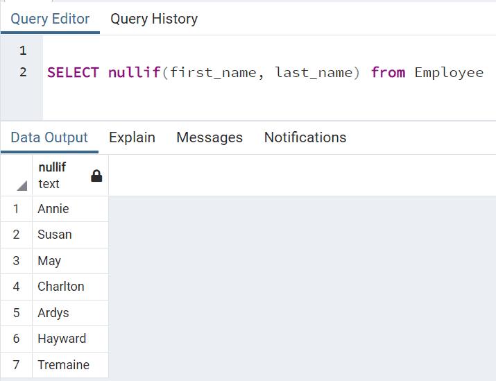 SELECT nullif(first_name, last_name) from Employee