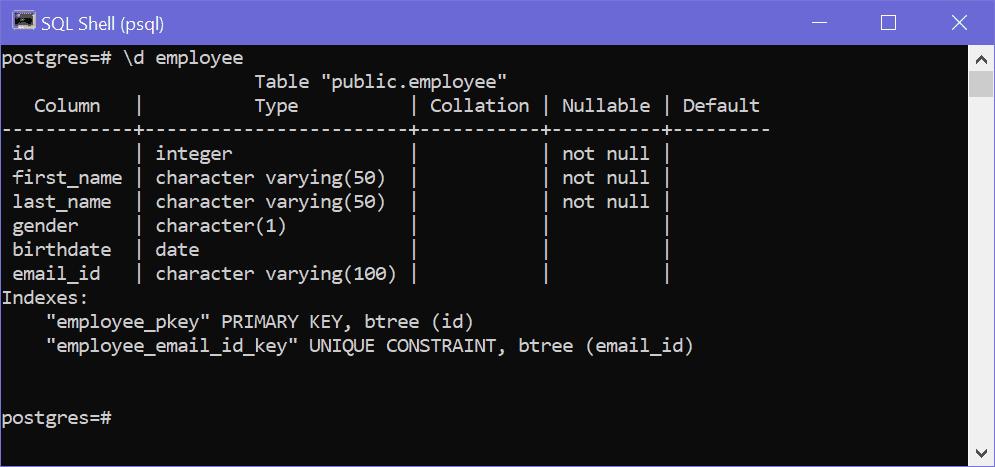 RENAME birthdate TO date_of_birth;Note: If you rename column which is being referenced in another database objects like views, foregin key constraints, functions, procedures or triggers, then Postgres will automatically change column name in those dependent objects. For example, if email_id column of the employee table is used in some database procedure and you rename email_id to email, then it will be automatically changed in procedure which is referencing it.