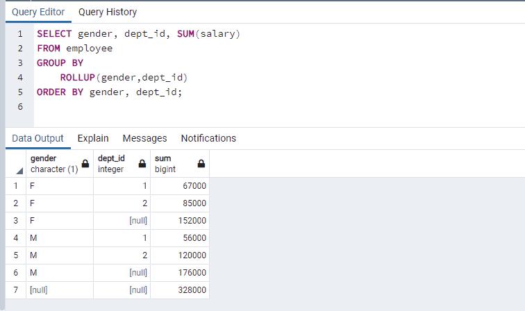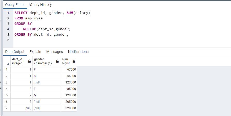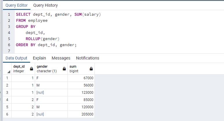 The following query uses the ROLLUP clause to find the total salary of employees, the total salary of employees by dept_id, and the total salary of employees (subtotal) by dept_id and gender.