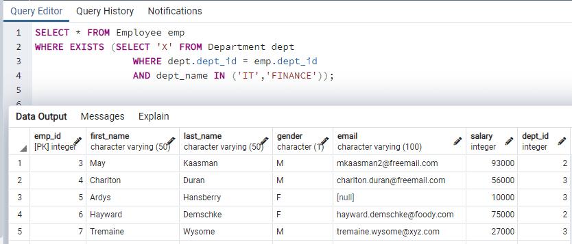 As you can see, we are getting the same rows in the result set as using IN operator. The subquery has a joining condition dept.dept_id = emp.dept_id that performs an inner join between the Employee and Department tables. For each row of the Employee table, the subquery is executed once to check whether that employee belongs to the IT or FINANCE department or not. If for an employee, a matching row is found in the department then that employee will be shown in the result set.