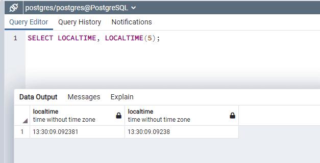 SELECT LOCALTIME, LOCALTIME(5);
