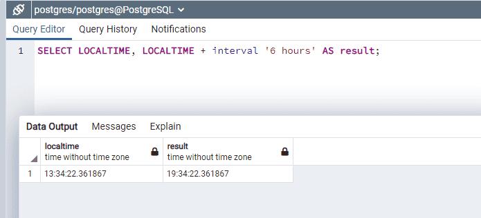 SELECT LOCALTIME, LOCALTIME + interval '6 hours' AS result;