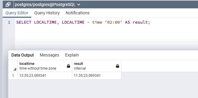 SELECT LOCALTIME, LOCALTIME - time '02:00' AS result;