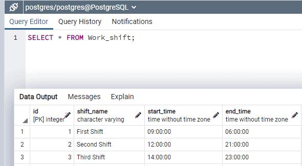 Let's check the data we inserted into Work_Shift table.