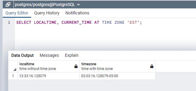 SELECT LOCALTIME, CURRENT_TIME AT TIME ZONE 'EST';