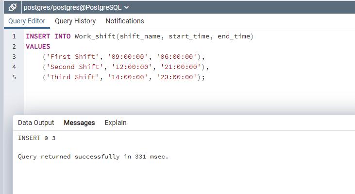 INSERT INTO Work_shift(shift_name, start_time, end_time)