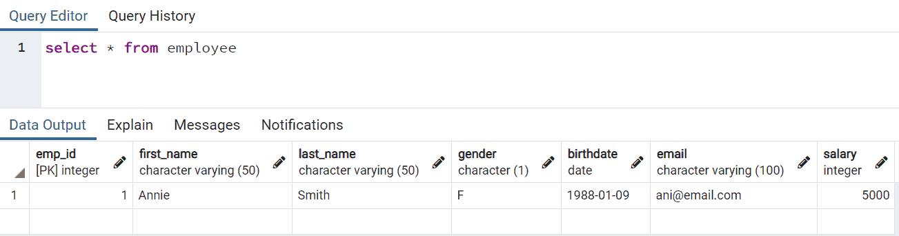 VALUES(1,'Annie','Smith','F', DATE '1988-01-09', '[email protected]',5000)