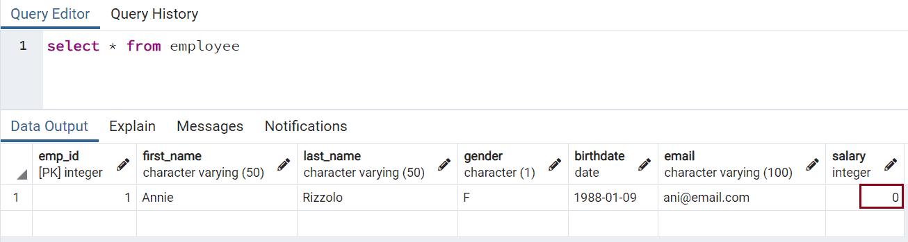 The above would update the salary field to 0, as shown below.