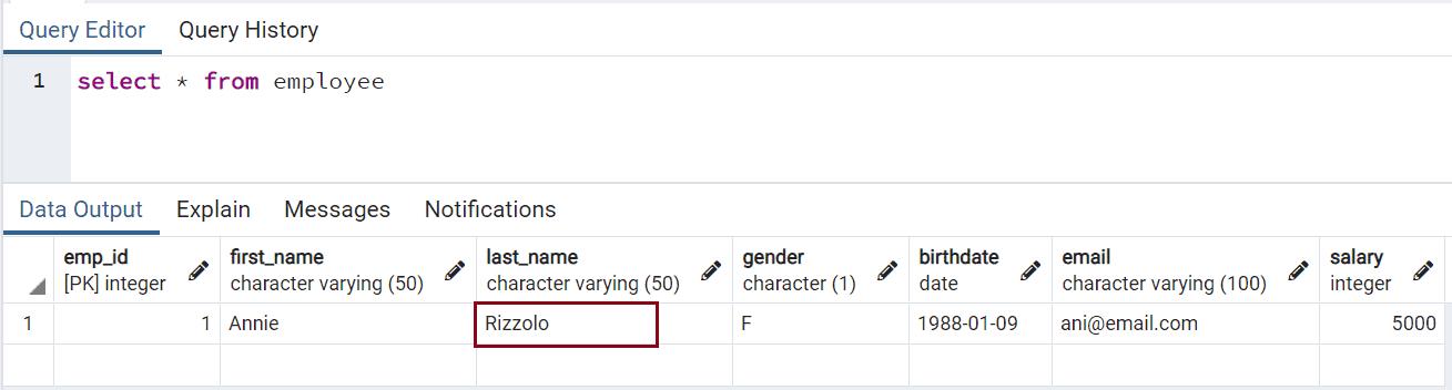 Let's check the data in the table, you can see the last_name is changed to 'Rizzolo'.