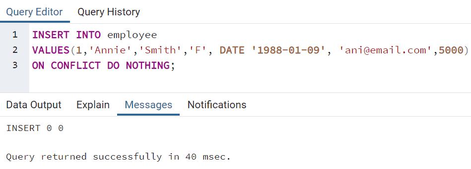 If you use the ON CONFLICT DO NOTHING statement with the INSERT statement then it will not raise any error and will not insert any rows into the employee table, as we are asking to DO NOTHING in case of conflict.