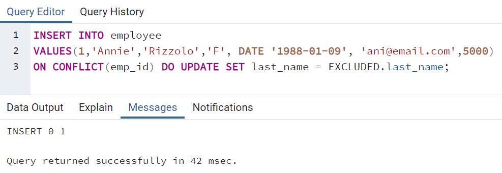 In the above result, INSERT 0 1 indicates 0 rows inserted and 1 row updated. PostgreSQL will try to insert a record, but because the emp_id column already contains 1, the conflict will occur and it will execute the DO UPDATE SET last_name = EXCLUDED.last_name statement.