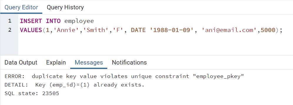 The above employee table has the emp_id as a Primary key and data already there for emp_id = 1. If you try to insert a new record with emp_id = 1 then it will raise an error.