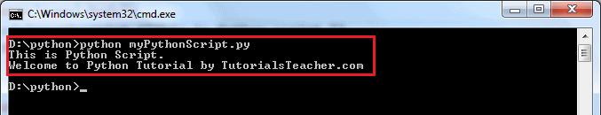 print ("Welcome to Python Tutorial by TutorialsTeacher.com")Save it as myPythonScript.py, navigate the command prompt to the folder where you have saved this file and execute the python myPythonScript.py command, as shown below. It will display the result.