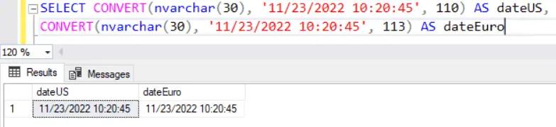 CONVERT(nvarchar(30), '11/23/2022 10:20:45', 113) AS dateEuro;