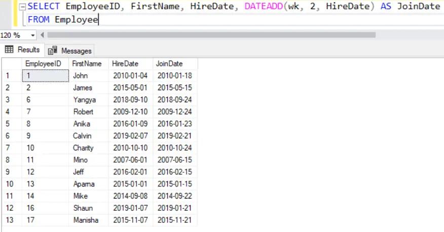 The following DATEADD() function is used with the HireDate column of the Employee table to return the JoinDate. Two weeks is added to the HireDate column to return JoinDate.