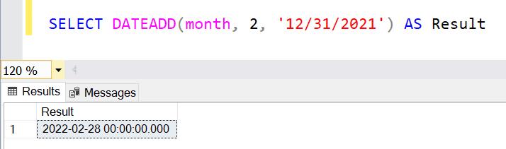 In this example, for the month datepart, 2 is added to date '12/31/2021'. As you can see in the result, two months is added to the input date and the DATEADD() function returns 28th February 2022, which is the last day of the returned date.