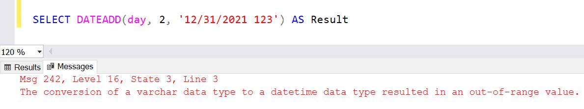 The following example adds 1 day to the specified date '12/31/2021' (31st December 2021).