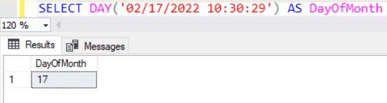 SELECT DAY('02/17/2022 10:30:29') AS DayOfMonth