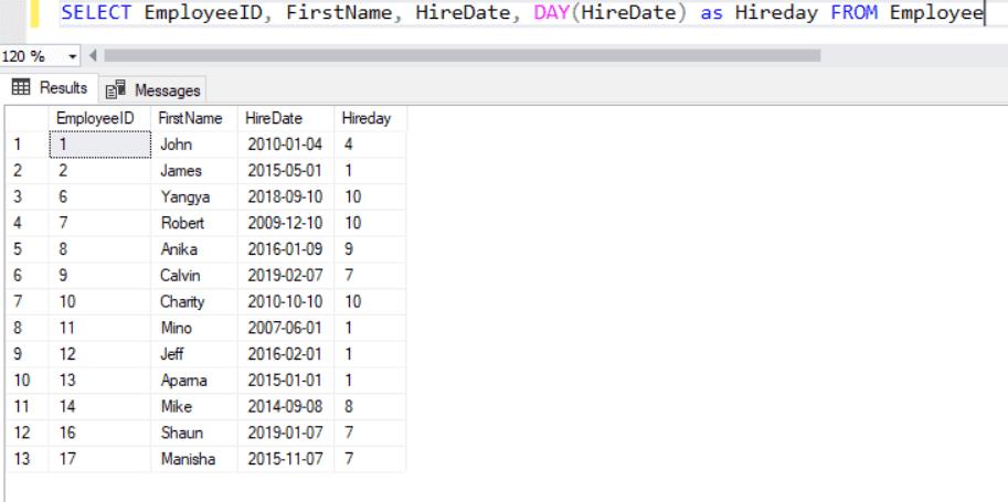 In the following example, the DAY() function is used to get the day part of the HireDate column of the Employee table.