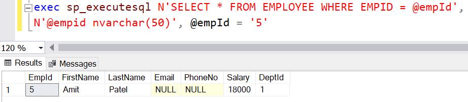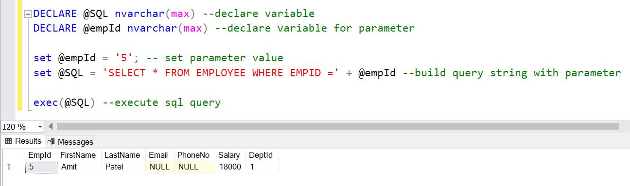 exec(@sql) --execute sql queryIn the above example, we first declare variables, @sql for SQL query and @empId for the parameter. Then, @empId = '5' statement assigns value to a variable. The set @sql = statement builds the SQL query as a string and appends parameter variable using + operator. Finally, exec(@sql) executes the @sql string and returns the result.