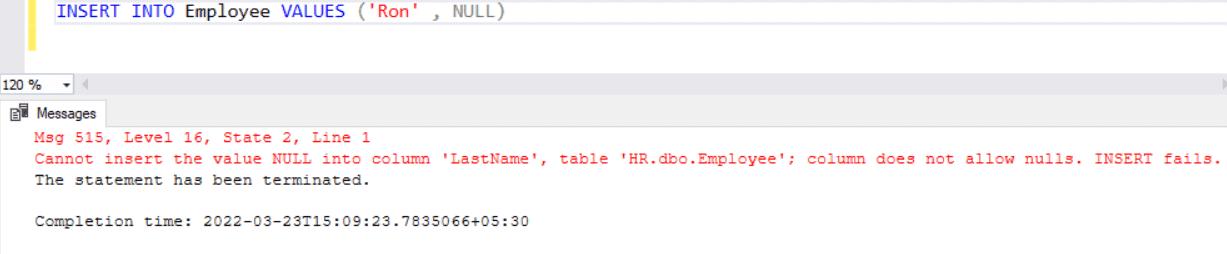 Let's execute the following statement which will raise an error because it tries to enter NULL in the NOT NULL column.
