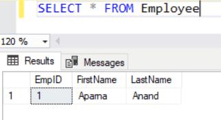 As you can see, we have not specified the value for the EmpID column. It automatically inserts a value for the identity column EmpID, which is 1. If you insert another record then it will be 2.