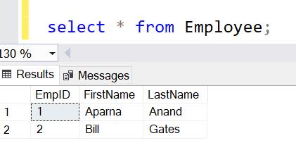 INSERT INTO Employee VALUES('Bill' , 'Gates');The above statement will insert the following record.