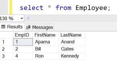 INSERT INTO Employee VALUES('Ron', 'Kennedy');The above statement will insert a row where the EmpID value will be 4 and not 3, as shown below. Thus, even if an error occurred in the transaction, the identity column value will still be increased.