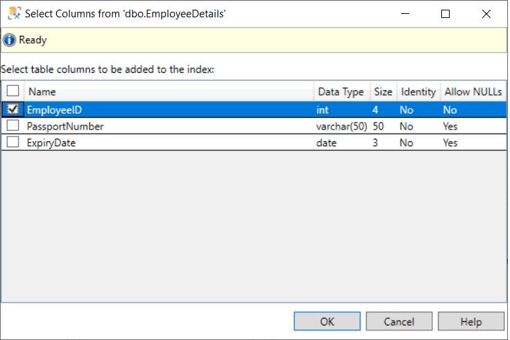 Step 5: In the Select Columns from table name dialog box, select the checkbox of the column(s) to be added to the clustered index.