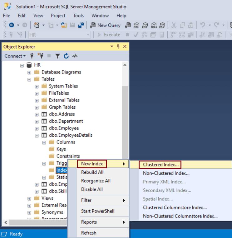 Step 2: Right-click on the Indexes folder. Point to New Index and, select Clustered index.., as shown below.